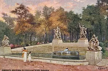 Die Brunnenanlage mit den Schillingschen Figurengruppen am Neustädter Markt in Chemnitz. Von 1909-1928 standen sie als Bereicherung auf dem neu gestalteten Platz.