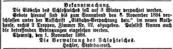 Noch 1885 wurde auch für die Kinder hiesiger Bürger und Bezirksschulen das kostenfreie Eislaufen an den konzert- und schulfreien Nachmittagen (dienstags und sonnabends) auf der Schloßteich-Eisbahn eingeführt. Man erkannte welche gesundheitlicher Bedeutung das Bewegen an frischer Luft an den kühlen Wintertagen für die in oft engen Wohnungen lebenden Kinder ärmlicher Verhältnisse brachte.