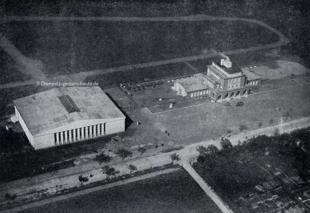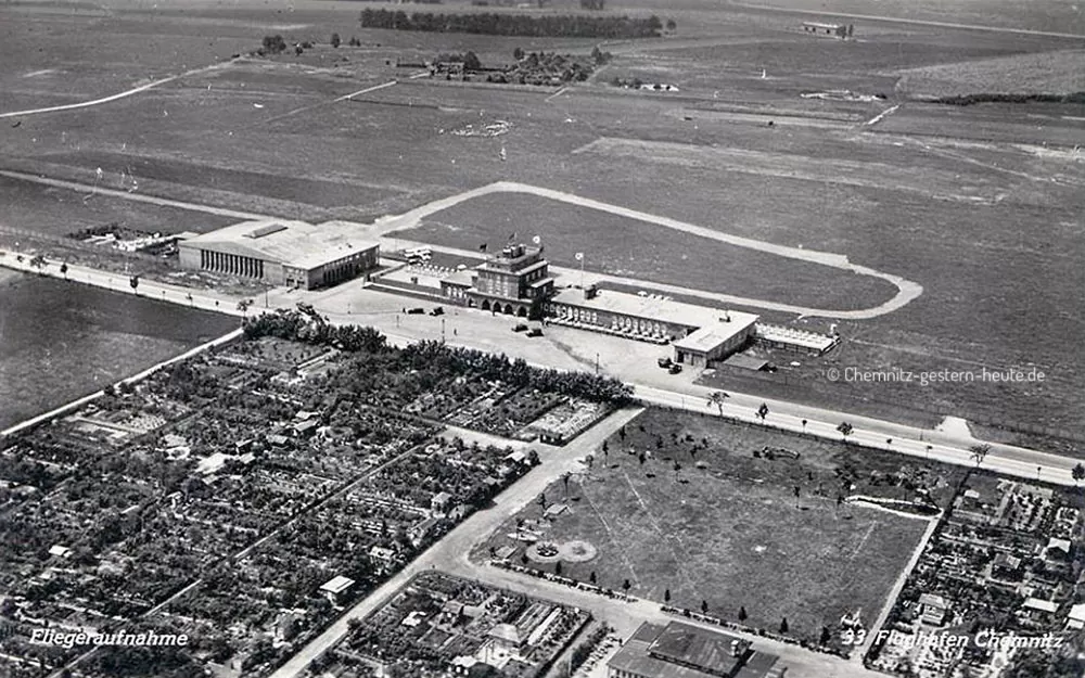 Als man im Jahre 1925 an den Bau eines Flughafens in Chemnitz heranging, war der Leitgedanke: Anlagen für die Zukunft schaffen! Und da man, bei dem damaligen Stand des Luftverkehrs, keine Riesenbauten schaffen konnte, mußte man den Bau im Vorhinein so gliedern, daß er alle Möglichkeiten für eine spätere Erweiterung ließ. 1926, zur Flughafeneinweihung, war nur der Mittelbau mit den kleineren Anbauten fertig geworden.