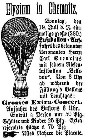 „Von einem herrlichen Wetter begünstigt, unternahm am 19. Juli nach sechs Uhr der bekannte Luftschiffer Securius vom „Elysium“ aus seine zweihundertachtzigste Ballonfahrt.