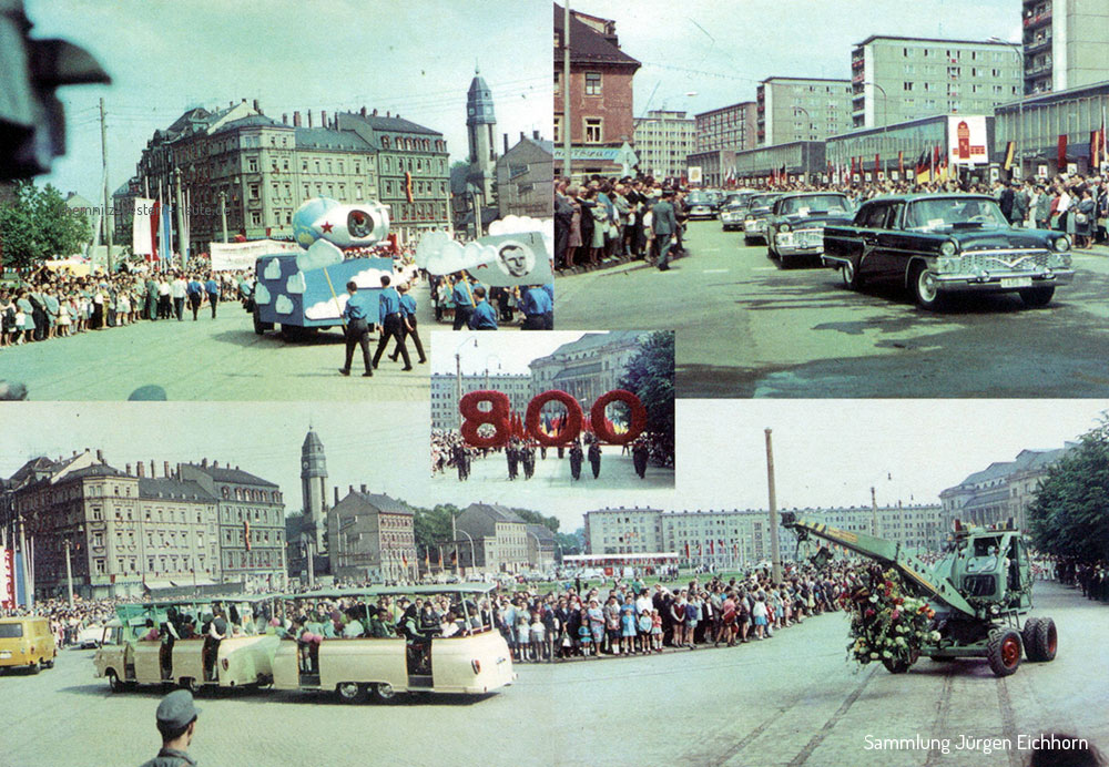 Das Jubiläum wurde schließlich unter der Schirmherrschaft von Walter Ulbricht als gigantische Selbstdarstellung inszeniert, um die Aufbauleistung der DDR und den Wandel von einer Stadt der „Unterdrückung und Ausbeutung“ hin zu einer modernen Industriestadt zu feiern.