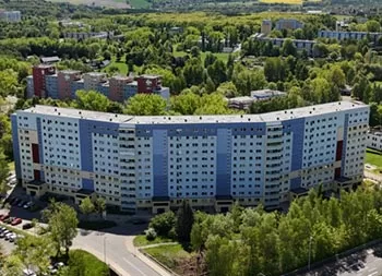 Drohnenaufnahmen vom Juli 2024 zeigen das Wohngebiet „Am Harthwald“ an der Wolgograder Allee und die „Markersdorfer Oase“ von oben
