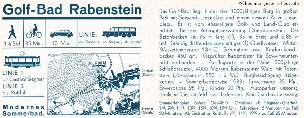 1933 wird das Bad nach Auflösung des Golfclubs durch Familie Herfurth für die Öffentlichkeit zugänglich gemacht. Im Bäderführer für Chemnitz desselben Jahres wird es mit dieser Annonce beworben. Zahlte ein Erwachsener in den Chemnitzer Bädern zwischen 10- und 30 Pfennig Eintritt, war das Rabensteiner Schwimmbad mit 35 Pfennig das Teuerste in der Umgebung. Das änderte sich noch im Laufe des Jahres, es waren schließlich nur 25 Pfennig Eintritt zu entrichten, wie wir aus anderen Quellen erfahren. Bemerkenswert auch der Hinweis: „Autoparken umsonst, direkt im Gesichtsfeld des Badenden“ Als erster Bademeister wurde Karl Hösel-Uhlig angestellt, der auch Schwimmunterricht gab. Schwierig gestaltete sich die Genehmigung zum Verkauf von Erfrischungen. 1933 hatte er unerlaubt bereits Wasser, Schokolade und Fischsemmeln verkauft. Erst im Juli 1934 erhielt seine Ehefrau nach Zwistigkeiten auch auf politischer Ebene die Konzession. Nur einen Monat später entzog man sie gleich wieder, gegen den Ehemann lag eine Anzeige vor. Das Ende für Familie Hösel-Uhlig. Zur neuen Saison 1935 verpachtete nun Familie Herfurth das Golfbad an Schwimmmeister Max Uhlig für 400,-RM jährliche Pacht.