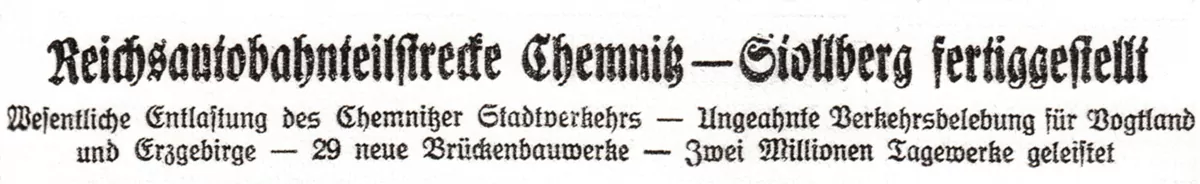 (Quellen: Bertram Kurze, Reichsautobahnen in Mitteldeutschland, Erfurt 2014; Ausgaben des Chemnitzer Tageblattes 12./15.8. 1939 – auf Mikrofilm verfügbar in der Stadtbibliothek Chemnitz)