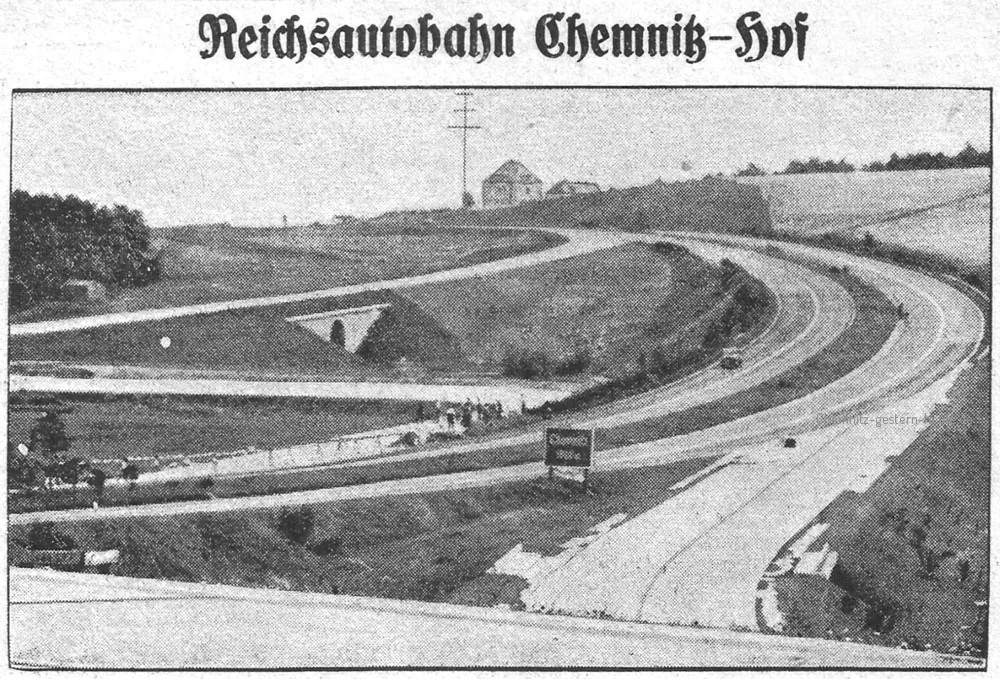 Nachdem am 3. Juni 1938 die Teilstrecke Treuen-Pirk und ein halbes Jahr später der Abschnitt von Zwickau-West bis Treuen mit zusammen 38 Kilometer durchgehender Streckenlänge der von Chemnitz nach Hof führenden Reichsautobahn dem Verkehr übergeben werden konnten, folgte am 15.August 1939 die Freigabe eines weiteren Teilstücks der geplanten Strecke Chemnitz – Hof-Naila.