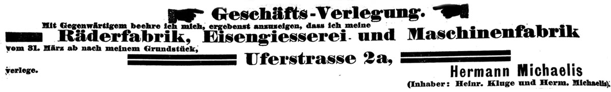 1888 erwarb H. Michaelis auf der Uferstraße ein Grundstück und errichtete dort sein neues Unternehmen. Der Umzug dahin erfolgte zum 31. März 1889.