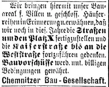 Am 2. Oktober 1872 konstituierte sich ein Aktienverein unter dem Namen der „Chemnitzer Bau-Gesellschaft“ mit dem Ziel, vorrangig den Bedürfnissen der mittleren Klassen gerecht zu werden. Bereits am 14. November 1872 waren 50% auf die vorgesehenen 2500 Aktien à 200 Thaler eingezahlt worden. Vom Verein wurde daraufhin ein Areal von ca. 1 Mill. Quadratellen (ca. 332.000 m²) rechts der Zwickauer Straße und ca. 500.000 Quadratellen (ca. 166.000 m²) zwischen der Annaberger Straße und dem Reichenhainer Weg erworben.