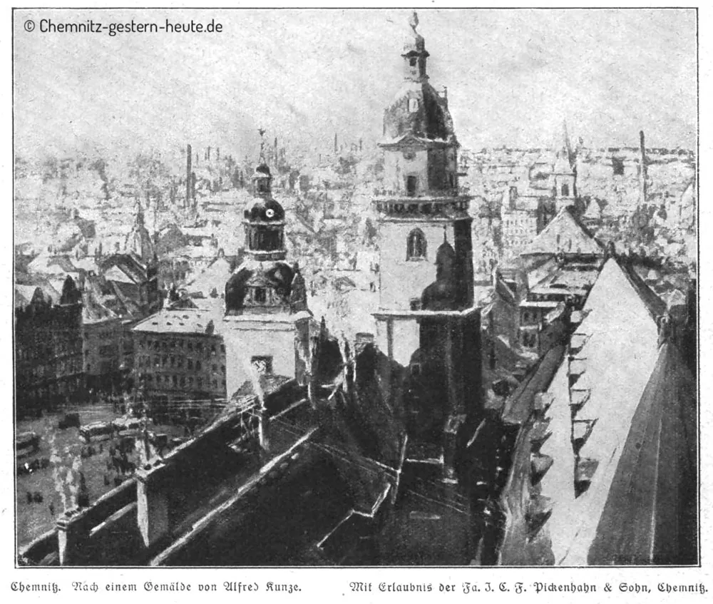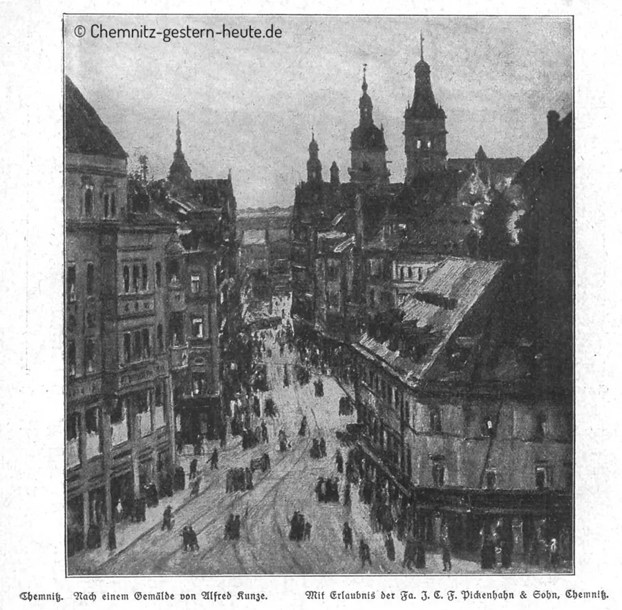Das Chemnitz trotzdem nicht eine sogenannte „schöne“ Stadt ist, hängt mit der ungeheuer raschen Entwicklung und Steigerung der Einwohnerzahl zusammen, mit der eine Verschönerung nicht Schritt halten konnte. Das Nützlichkeitsprinzip herrschte und der Urgeschmack der siebziger, achtziger und neunziger Jahre tat das Übrige hinzu. Da ist man im letzten Jahrzehnt vor dem Kriege bestrebt gewesen, eine Reihe von Prachtbauten zu errichten, und auch jetzt tauchen verschiedentlich Projekte auf, die eine rege künstlerische Bautätigkeit erwarten lassen. Mit seinen 325.000 Einwohnern ist Chemnitz die größte Fabrikstadt unseres Vaterlandes geworden. Mächtige industrielle Werke tragen den Ruhm der Chemnitzer Arbeit in alle Welt hinaus. Dabei sind Eisen- und Textilbranche zu gleicher Weise beteiligt. Was wird nicht alles in Chemnitz hergestellt!