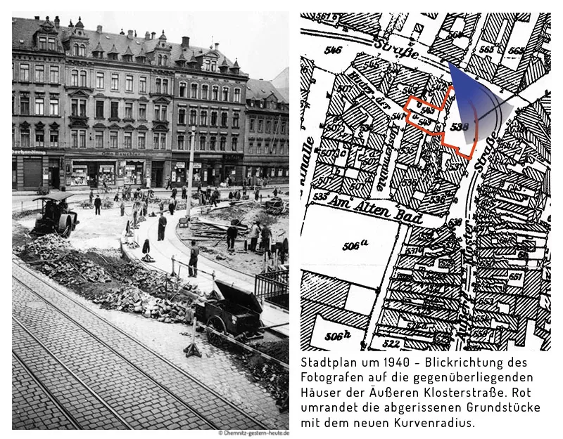 Werfen wir als nächstes einen Blick auf die Bauarbeiten 1939 – die Abrissarbeiten der alten Gebäude sind beendet, der Kurvenradius wird von einer tüchtigen Anzahl von Bauarbeitern verbreitert, damit die Straßenbahn ungehindert einbiegen kann. Gegenüber die Häuser der Äußeren Klosterstraße. Von rechts: Nr.32 – Kolonialwarengroßhandlung Klemm, Nr.34 – Otto Fiedler Glaserei und Friseurgeschäft Albert Gutsche, Nr.36 – die Kolonialwarenhandlung von Otto Beuchler, links noch ein Teil der Nr. 40 sehen – Bäckerei E. Meyer, Nr. 38 fällt aus. (Stand: Adressbuch Chemnitz 1939)