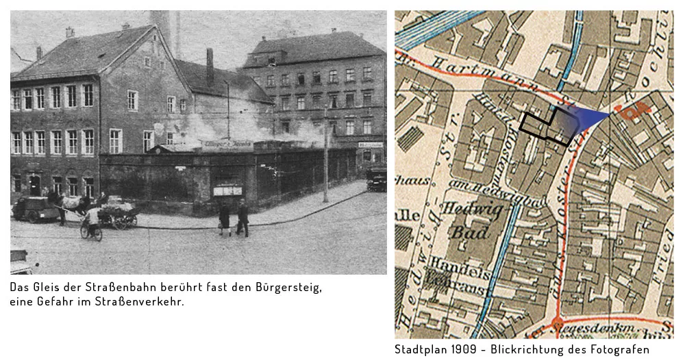Werfen wir als nächstes einen Blick auf die Bauarbeiten 1939 – die Abrissarbeiten der alten Gebäude sind beendet, der Kurvenradius wird von einer tüchtigen Anzahl von Bauarbeitern verbreitert, damit die Straßenbahn ungehindert einbiegen kann. Gegenüber die Häuser der Äußeren Klosterstraße. Von rechts: Nr.32 – Kolonialwarengroßhandlung Klemm, Nr.34 – Otto Fiedler Glaserei und Friseurgeschäft Albert Gutsche, Nr.36 – die Kolonialwarenhandlung von Otto Beuchler, links noch ein Teil der Nr. 40 sehen – Bäckerei E. Meyer, Nr. 38 fällt aus. (Stand: Adressbuch Chemnitz 1939)
