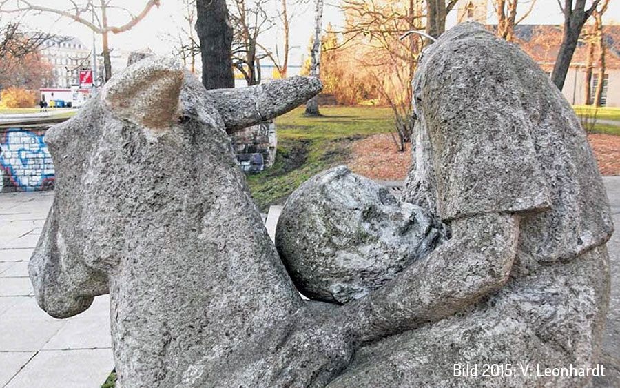 Noch einmal zum Eselreiter. Im April 2015 wurde er durch Vandalismus beschädigt – nicht zum ersten Mal, wie sich bei der nachfolgenden Reparatur herausstellte. Eine Chemnitzer Gästeführerin fand die zerstörte Skulptur mit dem Kopf, der lose im Schoß des Reiters lag. Bereits im Juli wurde der Restaurator Matthias Mann von der Stadt beauftragt, die Schäden zu beseitigen und das lange Zeit verwahrloste Objekt zu reinigen. In nur sieben Tagen wurden Bruchstellen und Risse ausgebessert, Schmierereien entfernt und der Sockel neu ausgerichtet. So finden wir den Eselreiter noch heute an seinem alten Platz. Ihr nächster Spaziergang sollte sie auch wieder einmal mit diesen Informationen zum ihm führen.