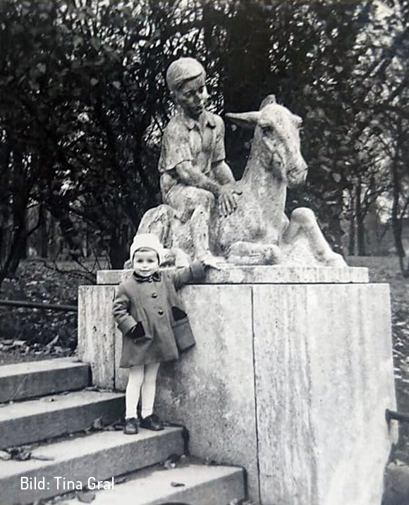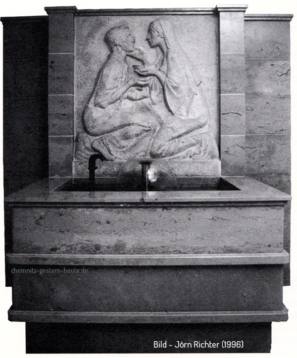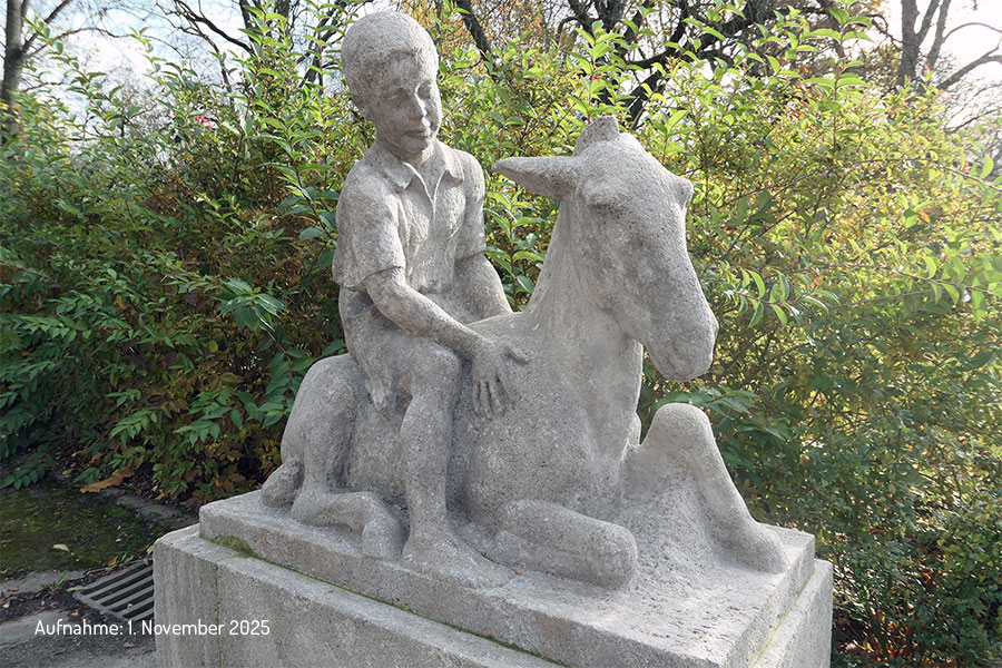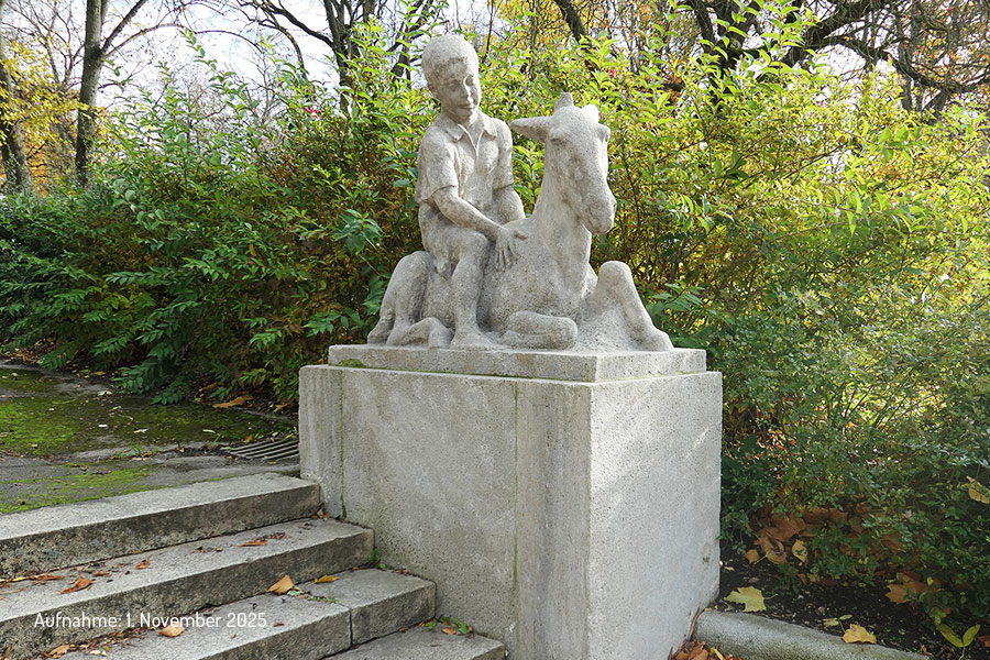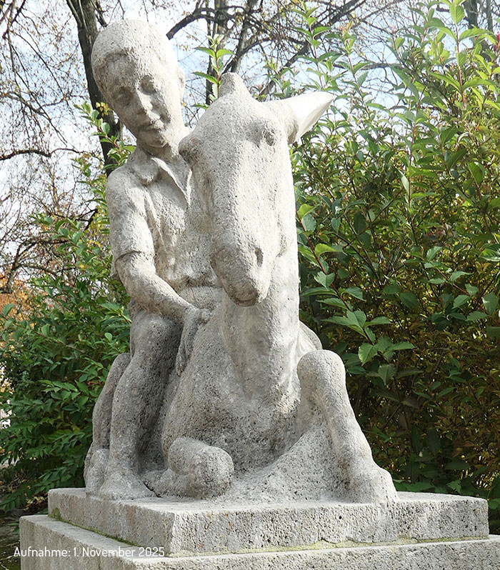 Das in Kirchheimer Muschelkalk ausgeführte Kunstwerk stammt von dem Chemnitzer Bildhauer Emil Mund. Es stellt einen Knaben dar, der aus einem ruhenden Eselchen sitzt. Schalkhaft behandelt der Künstler einen im weiten Reiche der bildenden Kunst gern bearbeiteten Stoff, das Verhältnis: Mensch und Tier. Schon in den ersten Tagen erregte die entzückende Bildnisgruppe die Aufmerksamkeit aller Vorübergehenden, wie Chemnitzer Tageszeitungen damals schrieben.