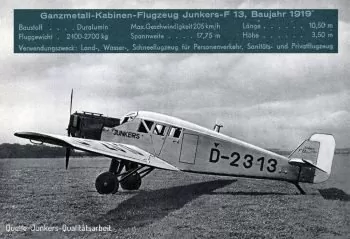 Zur Junkers F13: Im Jahre 1919 wurde sie erstmals vorgestellt und absolvierte Ihren Erstflug. Bis zum Jahre 1930 wurden in den Junkers-Flugzeugwerken in Dessau insgesamt 346 Stück dieser vielseitigen Maschine gebaut, wobei die höchstgebaute Stückzahl pro Jahr 75 Exemplare im Jahre 1924 war.