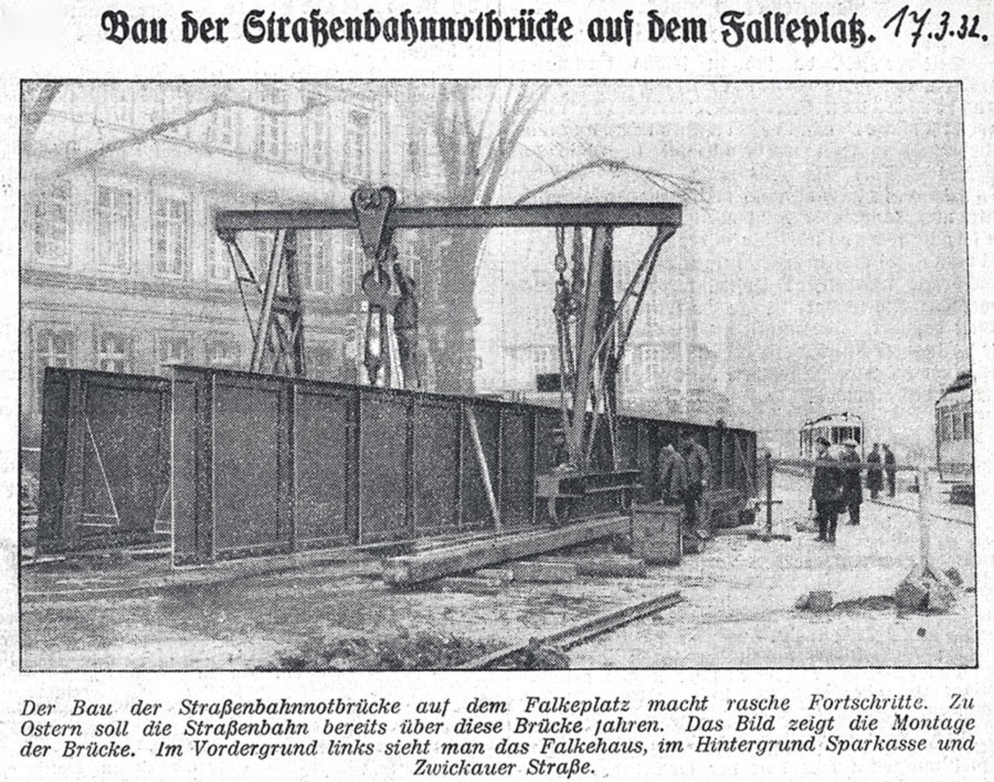 Um den Verkehr auf dem belebten Knotenpunkt trotz des finanziellen Vakuums aufrechtzuerhalten, griff die Stadt zu Mitteln der technischen Improvisation. Unter Hochdruck wurde eine eiserne Straßenbahnnotbrücke errichtet, die pünktlich zum Karfreitag im März 1932 in Betrieb genommen werden konnte und das verkehrsstörende Umsteigen der Fahrgäste endlich beendete. Das stählerne Provisorium ermöglichte zudem einen eingeschränkten Einbahnstraßenverkehr für Fahrzeuge bis 10,8 Tonnen in der Richtung von der Langen Straße zur Zwickauer Straße, während der Gegenverkehr weiterhin weiträumig umgeleitet werden musste. Die Dringlichkeit dieser Lösung wurde durch den Zustand der Kaßbergauffahrt unterstrichen, die zu diesem Zeitpunkt die einzige verbleibende Brücke für Lasten über 12 Tonnen war und deren eigenes Überleben nur noch eine Frage von Monaten schien. So bildete die Notbrücke eine wichtige Lebensader, die den totalen Verkehrskollaps verhinderte, während man mit banger Erwartung auf den nächsten Winter blickte, dem die unterspülte Substanz des Platzes kaum ein zweites Mal standgehalten hätte.