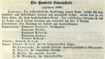 Auf Initiative der „Genossenschaft des Fabrik- und Handelsstandes“ wurde die Öffentliche Handelslehranstalt im Januar 1848 mit zunächst 71 Schülern eröffnet. Ihr deklarierter Bildungsauftrag war, wie eine Quelle aus dem Jahr 1850 festhält, die „wissenschaftliche Ausbildung junger Leute, welche sich dem Handels- und Fabrikstande widmen“. Über einen dreijährigen Lehrgang sollte der Nachwuchs nicht nur eine erschöpfende Einführung in das werktätige Leben erhalten, sondern auch zu charaktervollen Staatsbürgern geformt werden – eine Mission, die der erste Schulvorstand unter dem Vorsitz von Subrector Caspari zu verantworten hatte.