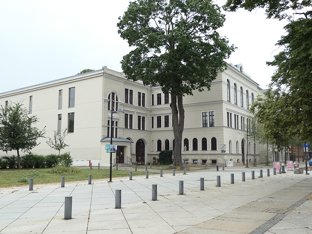 Die ersten Domizile der Anstalt spiegelten ihre bescheidenen Anfänge wider. Zunächst war sie in einem Haus an der Ecke Theater-/Lohstraße untergebracht, bevor sie in Räumlichkeiten am Neumarkt 8 umzog. Bis 1869 stand dort der Schule jedoch lediglich die zweite Etage zur Verfügung, was zu äußerst beengten Verhältnissen führte. Bis 1879 nutzte man anschließend das Gebäude Äußere Klosterstraße 19.