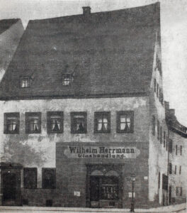 Mit Errichtung des Alten Rathauses zwischen 1496 und 1498 entstand ebenso eine lebhafte bürgerliche Baufreudigkeit am Markt, Neumarkt, in der Klostergasse und am zukünftigen Holzmarkt. Denn erst seit 1531 hatten die Häuser ihre eigene Bezeichnung „Am Holzmarkt“, vorher wurden sie dem Markt zugeordnet. Eine Reihe stattlicher Häuser müssen um dieser Zeit errichtet worden sein. Zeugnisse davon sind das im Beitrag zum Römischen Kaiser und dem Lucretia-Portal betrachtete Haus des Tuchhändlers Merten Groß, das Schütze’sche Haus an der Ecke Johannis-/Bachgasse (die Adler-Apotheke), das Rauschelbach’sche Wohnhaus am Neumarkt und das hochgiebelige Hermann’sche Haus an der Ecke des Holzmarktes zum Roßmarkt.