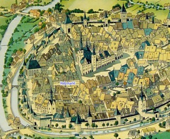 Seine Entstehung können wir bis ins 14. Jahrhundert zurückverfolgen. Nach dem großen Stadtbrand von 1333, der das frühmittelalterliche Chemnitz fast vollständig zerstörte, wurde das Stadtbild neu angelegt. Zum Schutz in unsicheren Zeiten wurde eine Stadtmauer mit Wehrtürmen errichtet, wie schon die 1. Stadtansicht von Dilich um 1630 zeigt. Um die heutige Jacobikirche entstand ein neuer Marktplatz mit Rathaus und kleinteiliger Bebauung. Nach Westen entstand in Form einer konischen Straßenverbreiterung der spätere Holzmarkt und an diesen nach Südwesten anschließend, in gewisser Selbständigkeit der Roßmarkt. Der mittelalterliche Grundriss zeigt das verwinkelte Straßen- und Gassennetz.