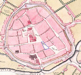 Während des Dreißigjährigen Kriegs (1618–1648) wurde die gewerbefleißige Stadt nicht nur von der Pest heimgesucht, sondern sie wurde auch durch Belagerungen innerhalb weniger Jahre zerstört. Um Ostern 1634 brannten die Häuser beidseitig des Holzmarktes, am Kornmarkt (Getreidemarkt), an einer Seite der Langgasse sowie etliche bereits wiederaufgebaute Häuser in der Kloster-, Loh- und Webergasse nieder.