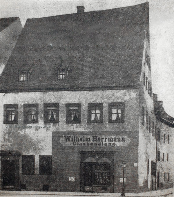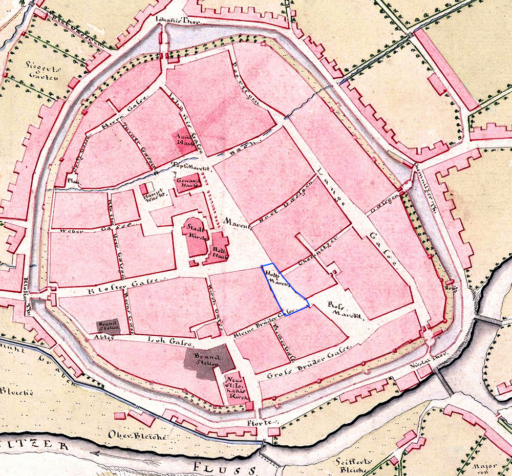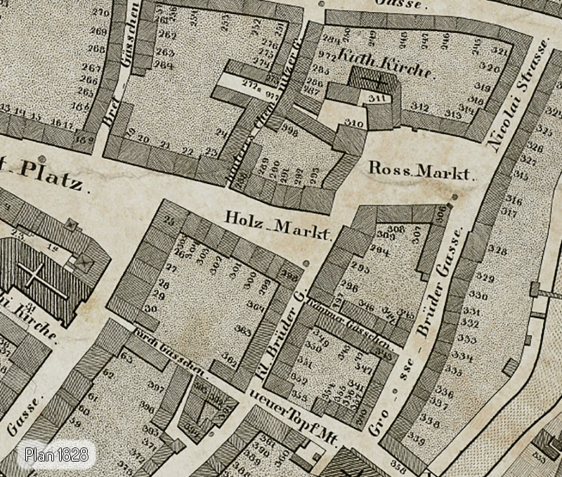 Mit Errichtung des Alten Rathauses zwischen 1496 und 1498 entstand ebenso eine lebhafte bürgerliche Baufreudigkeit am Markt, Neumarkt, in der Klostergasse und am zukünftigen Holzmarkt. Denn erst seit 1531 hatten die Häuser ihre eigene Bezeichnung „Am Holzmarkt“, vorher wurden sie dem Markt zugeordnet. Eine Reihe stattlicher Häuser müssen um dieser Zeit errichtet worden sein. Zeugnisse davon sind das im Beitrag zum Römischen Kaiser und dem Lucretia-Portal betrachtete Haus des Tuchhändlers Merten Groß, das Schütze’sche Haus an der Ecke Johannis-/Bachgasse (die Adler-Apotheke), das Rauschelbach’sche Wohnhaus am Neumarkt und das hochgiebelige Hermann’sche Haus an der Ecke des Holzmarktes zum Roßmarkt.