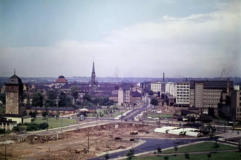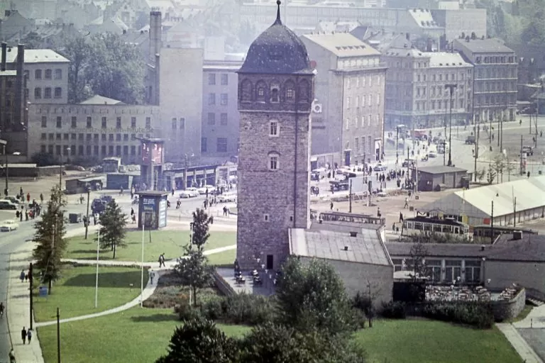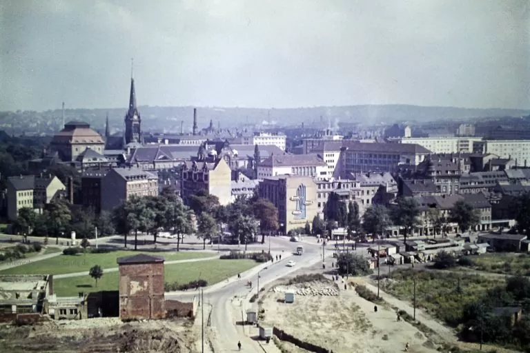 In Bildmitte der Straßenverlauf der Friedrichstraße hinüber zur Brückenstraße mit den Ständen des Brückenmarktes und dem Friedrichplatz. Dort stand das 1. Volksbrausebad, das aber dem Bedürfnis nach einem Parkplatz, wie hier im Bild auch noch zu erkennen, weichen mußte.