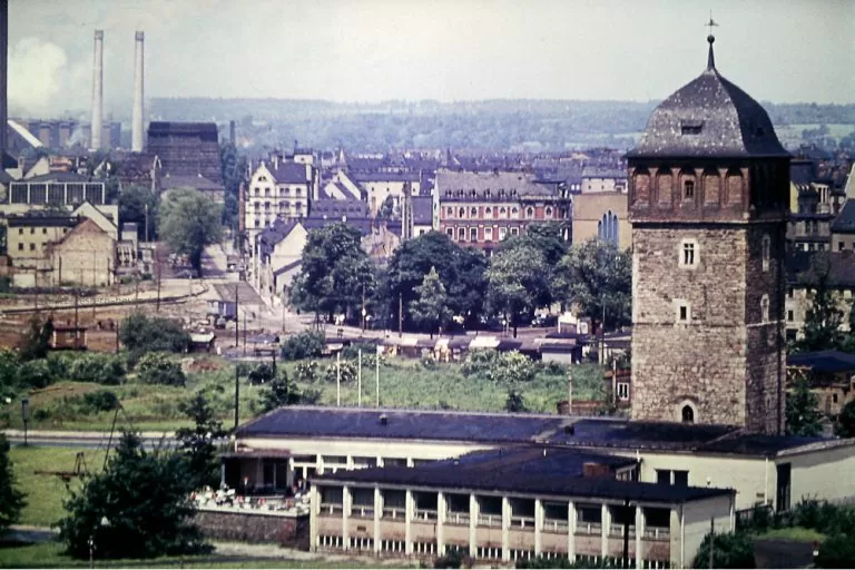 Als letzter Rest der ehemaligen Stadtbefestigung steht der Rote Turm im Stadtzentrum. 1945 ausgebrannt, erhielt er 1957/58 seine alte Turmhaube zurück, das Kaffee am Roten Turm wurde 1959 errichtet und im Zuge der Innenstadtneubebauung 1996 abgerissen.