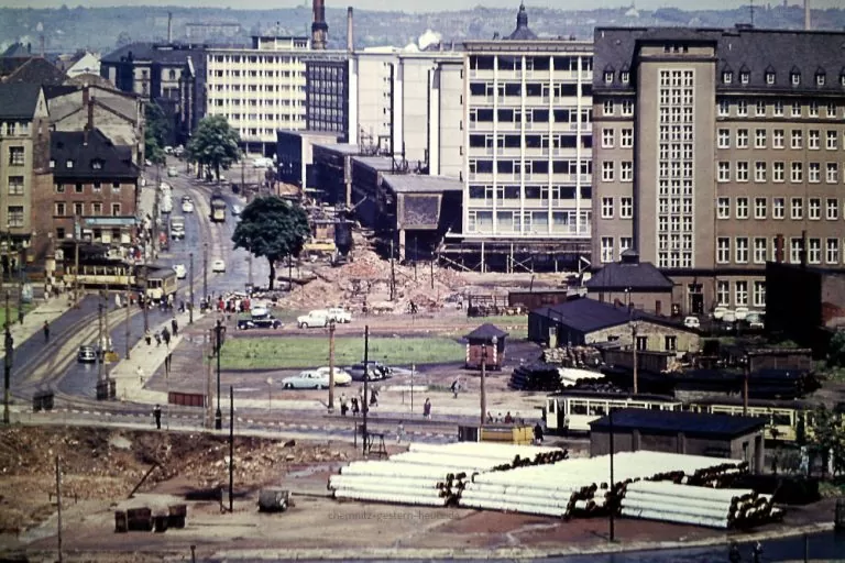 Wir blicken direkt in die ehemalige Theaterstraße in Richtung Johannisplatz. An der Brückenstraße entsteht am linken Bildrand gegenüber dem Gebäude der „Freien Presse“ bereits das nächste Bürogebäude, in dem der VEB Hochbauprojektierung sein neues Domizil findet und später im Erdgeschoss Fahrzeuge der „volkseigenen“ Produktion gekauft bzw. bestellt werden können.