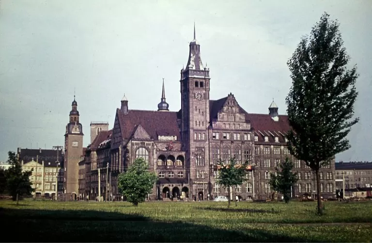 Das neue Rathaus hat 20 spannende Jahre hinter sich. In den 40er Jahren noch eingebettet in ein Häusermeer, erlebte es die Zerstörung und den Abriss der Häuserzeilen am Neumarkt und in der Friedrich-Auguststraße.