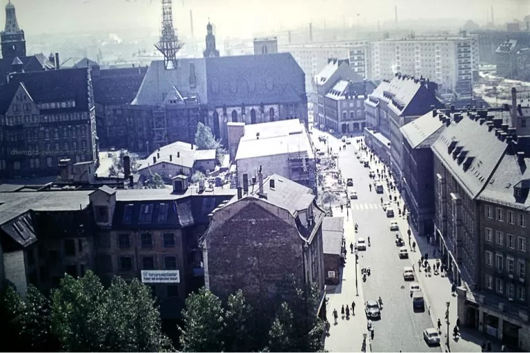 Der Dachaufbau der Jacobikirche schreitet voran. Neben dem Rathaus steht links das alte Gebäude des Kaffee Bienenstock, das in die Nachkriegsjahren noch als Haus des Handwerks überlebte.