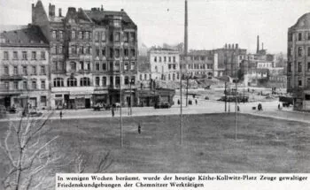 Die Zerstörungen waren noch lange sichtbar. Unter der Losung „Selbsthilfe und freiwilliger Arbeitseinsatz“ wurden die Chemnitzer Bürger aufgefordert, die ersten gröbsten Schäden zu beseitigen. Darunter waren viele Trümmerfrauen, bis Mitte der 50er Jahre beräumte man die Straße(n) von den Hinterlassenschaften der Luftangriffe. Der neu geschaffene Käthe-Kollwitz-Platz, der zwischen der ehemaligen Museums-, Zimmer- und Marienstraße lag, diente dabei zunächst als großer Aufmarsch- und Veranstaltungsplatz. Ein neu errichteter Pavillon mit Wandelhalle diente dort für verschiedene Ausstellungen und Kleinmessen.
