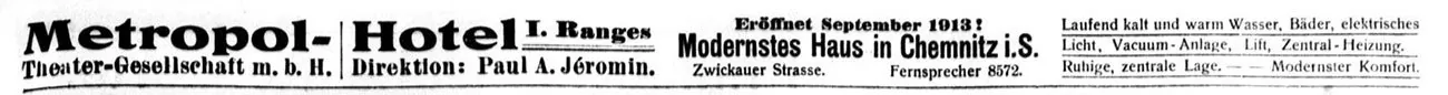 Gleichzeitig wurde das sich anschließende „Metropol-Hotel“, als eines der modernsten Häuser in Chemnitz mit erstklassigem Komfort unter der Leitung von Paul A. Jeromin eröffnet. Eine ganze Anzahl Artisten hatten sich sofort in den anheimelnden Zimmern niedergelassen. Als Gesellschaft wurde die Firma „Hotel Monopol-Metropol Paul A. Jeromin“ am 27. Oktober 1914 auf Blatt 7048 ins Handelsregister eingetragen. Paul Jeromin hatte zeitgleich auch das Monopol-Hotel in der Friedrich-August-Straße 4 übernommen.