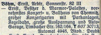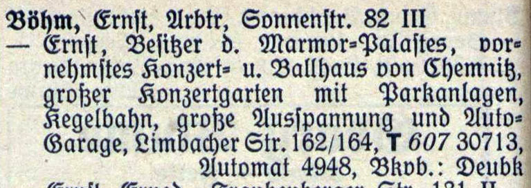 Der Marmorpalast, einer der bekanntesten und beliebtesten Chemnitzer Vergnügungslokale, soll später Gegenstand eines eigenen Artikels werden.