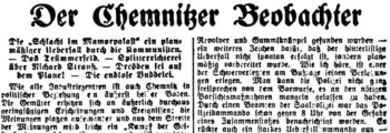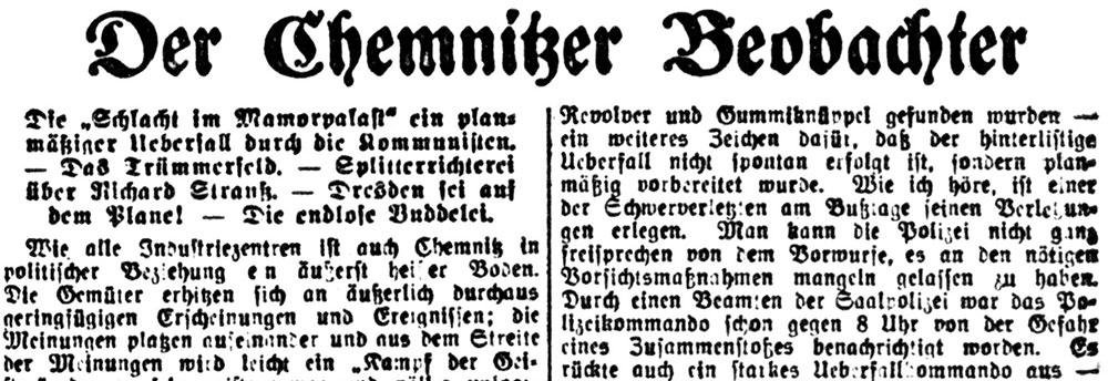Wie alle Industriezentren ist auch Chemnitz in politischer Beziehung ein äußerst heißer Boden. Die Gemüter erhitzen sich an äußerlich durchaus geringfügigen Erscheinungen und Ereignissen; die Meinungen platzen aufeinander und aus dem Streite der Meinungen wird leicht ein „Kampf der Geister“, der in sehr geistesarmer und völlig unlogischer Form mit den Fäusten oder mit den Knüppel ausgetragen wird. Man hat seit dem 9. November 1918 in dieser Hinsicht sich schon an manches gewöhnt, was früher zu den Ausnahmeerscheinungen gehörte. Was aber die Kommunisten in der Nacht zum Bußtage an politischer Unduldsamkeit des Gegners und an brutalem, völlig vom Zaune gebrochenen Terror hier in Chemnitz sich geleistet haben, geht schließlich doch über die Hutschnur.