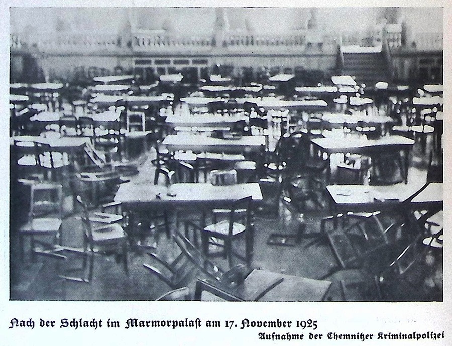 Diesen vom Versammlungsleiter verkündeten Schluß beantworteten die Kommunisten mit dem Anstimmen der „Internationale“, worauf die Nationalsozialisten das „Hitlerlied“ anstimmten. Da – ein Pfiff und einige Kommandoworte und von der Galerie flogen, von den Kommunisten geworfen, Biergläser, Stühle, ja sogar Tische mitten unter die im Parterre Versammelten. Die Lampen wurden größtenteils zerschlagen, um den Saal zu verdunkeln, auch auf den Kronleuchter wurden Wurfgeschosse in Masse gerichtet, um den gleichen Zweck zu erreichen. Unten im Saale tobte ein wüster Kampf und in wenigen Augenblicken bot der Marmorpalast ein Bild mit wüstester Zerstörung. Gegen 100 Tische und etwa 800 Stühle sind zerschlagen worden, 1000 Biergläser und 350 Kaffeetassen gingen als Wurfgeschosse in Trümmer und 40, zum Teil schwer Verletzte, darunter zwei Polizeibeamte, waren die Opfer des sinnlosen Kampfes.