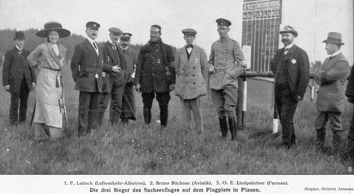 Nur noch 3 Flieger waren somit im Rennen. Auch der Start zur letzten Teilstrecke Plauen-Chemnitz mußte mehrfach verschoben werden. Schließlich wurde der Start von der Flugleitung für Mittwoch morgen ½ 4 Uhr freigegeben. Der Abflug von Büchner (3 Uhr 38 Min.), Laitsch (3 Uhr 46 Min.), und Lindpaintner (3 Uhr 50 Min.) ging glatt vonstatten. Büchner und Lindpaintner führten nach der vorgeschriebenen Zwischenlandung in Zwickau den Flug nach Chemnitz zu Ende, während Laitsch, nachdem er die Ziellinie in Zwickau bereits glücklich überflogen hatte, wegen Motordefekt in einem nahen Kornfeld niedergehen musste. Büchner landete in Chemnitz um 5 Uhr 27 Min. und Lindpaintner um 5 Uhr 54 Min. Laitsch setzte erst am Abend seine Fahrt von Zwickau nach Chemnitz fort. Er stieg um 19:15 Uhr in Zwickau mit seinem Passagier, Oberleutnant Eysen auf, er landete eine Stunde später glatt auf dem Flugfeld in Chemnitz. Kurz vor dem Zielband ging Laitsch nieder und überflog dieses erst nach 20:30 Uhr. Laitsch machte sich einen Passus der Ausschreibungen zunutze. Hätte er das Zielband vor ½ 9 Uhr überflogen, so kam er wegen der Strafpunkte auf den dritten Platz, da bis zu dieser Zeit für jede Stunde der Verzögerung eine bestimmte Anzahl Strafpunkte angerechnet werden musste. Da aber nach ½ 9 Uhr abends die Zeit nicht mehr gewertet wurde, sondern der nach dieser Zeit eintreffende Flieger die Pauschalsumme von 15 Strafpunkten erhielt, so langte er eben kurz nach 20:30 Uhr an. Durch die schon vorher erreichten Gutpunkte blieb Laitsch nach Abzug dieser 15 Strafpunkte immer noch Sieger.