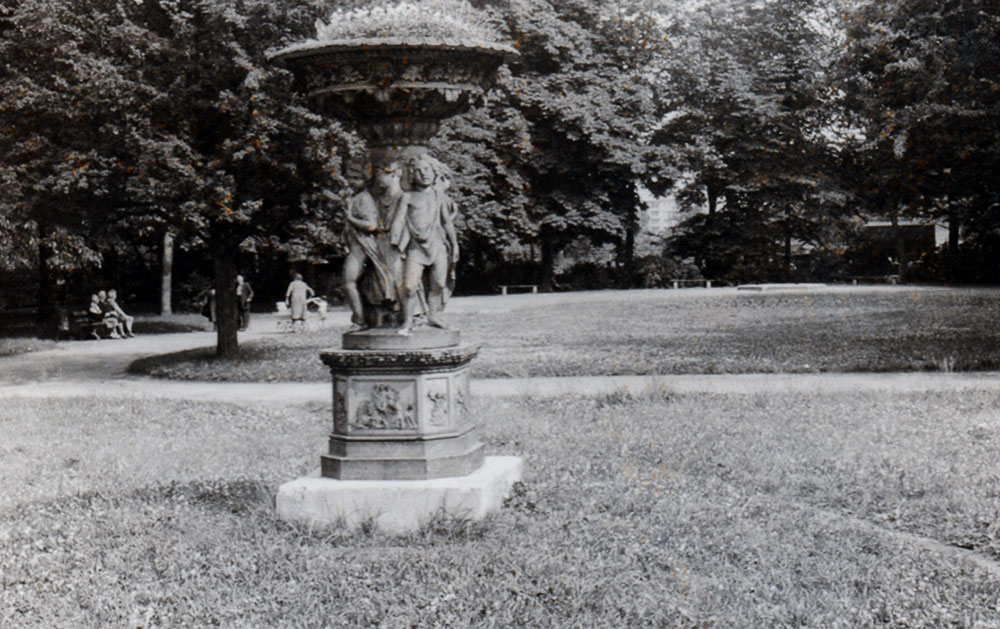 Er ist auf einigen Ansichten präsent, denn inmitten des grünen Rasenrondells stand ein vergessener Springbrunnen. Das kleine Meisterwerk wurde unstreitig nach Vorbildern des Klassizismus geschaffen. Die Schale oben fing einst den dünnen Wasserstrahl auf und wurde später mit Blumen bepflanzt. Um 1970 wurde er wie folgt beschrieben: „Seine Schmuckformen zeigen Akanthusblätter mit Rosetten, Ahornornamentik mit Löwenköpfen und eine Eierstabkante. Um den Block gruppieren sich Puttendreiergruppen mit losen Gewändern, von Rosen gehalten. Die darunter befindlichen Tritonenszenen sind leider stark beschädigt.“