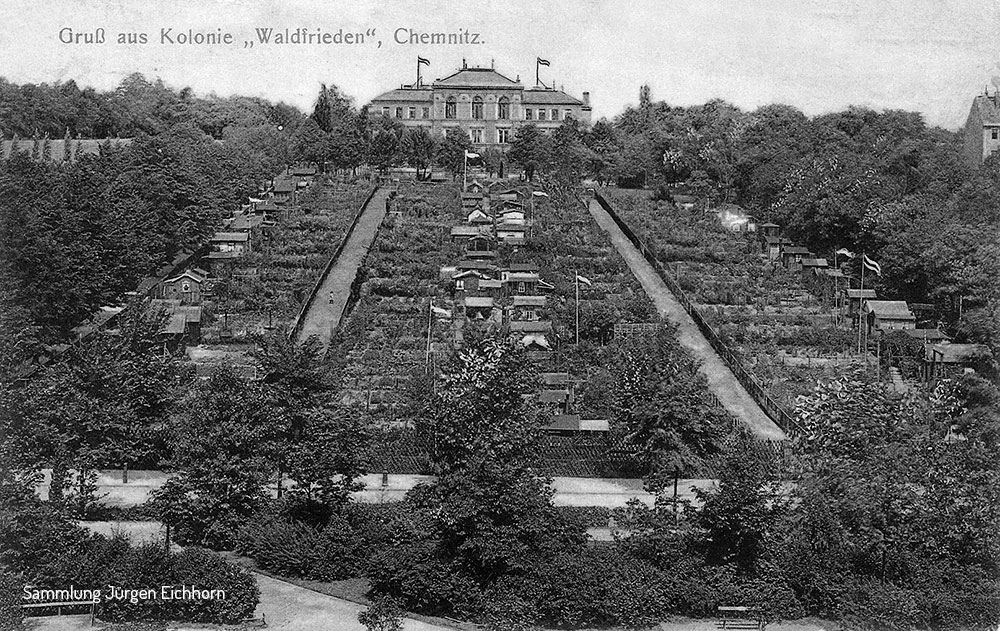 Kurz vor dem Ersten Weltkrieg entstand am Hang Richtung Küchwaldstraße die Kolonie „Waldfrieden“ als Kleingartenanlage. 1920 gründete sich daraus der Gartenbau-Verein „Waldfrieden“ in Chemnitz-Schloß. Dieser musste jedoch bereits Ende 1927 die Liquidation beantragen. Der Verein wurde 1927/1928 in den KGV „Am Frischborn“ (früher hieß er „Am Bismarkturm“) umgesiedelt. Ein Teil des Grundstücks musste den beginnenden Wohnbebauung am Kesselgarten weichen. Auf einem anderen Teil des verschiedenen Besitzern gehörigen Geländes befindet sich heute der 1948 gegründete Kleingartenverein Hechlerstraße.