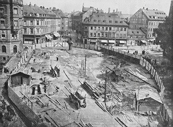 Der Blick vom Neuen Rathaus im Jahr 1951 zeigt die damalige Situation im Stadtzentrum. Von den ehemaligen Gebäuden, Gassen und Straßen rund um den ehemaligen Markt und Neumarkt ist fast nichts mehr zu erkennen.