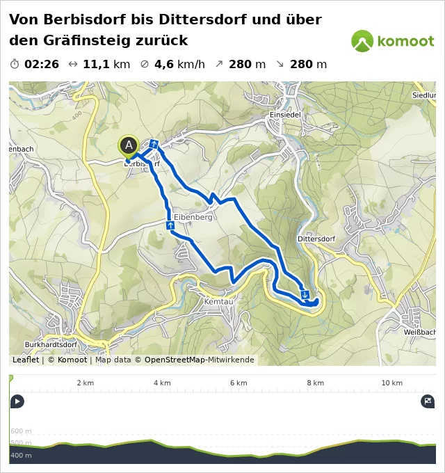 Wir wandern durch die Eigenheimsiedlung, folgen den Kirchsteig bis zur Kirche und biegen dann rechts Richtung Berbisdorfer Straße ab. Wir überqueren diese, rechts das Denkmal der Kriegsgefallenen, und nehmen die Anhöhe geradeaus Richtung Eibenberg. Hier gute Fernsicht nach Chemnitz zurück und nach Einsiedel.